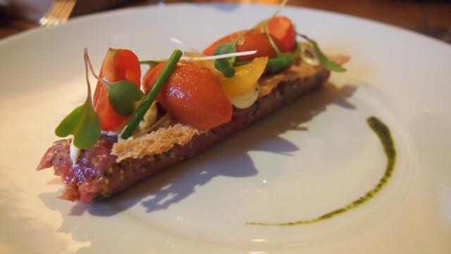 En entrée, j'ai opté pour le tartare de filet de bœuf, avec son sorbet de tomate, parmesan et truffe. Celui-ci s'est avéré savoureux et tendre. Le sorbet glacé se mixant au croustillant et à la fraîcheur de la viande est des ingrédients, offrait en bouche un bel équilibre des saveurs, des textures et des températures. Le vin rouge bio-dynamique (Pic Saint-Loup, Le Jardin des simples) proposé par l'excellent sommelier complétait bien cette entrée plutôt simple.
