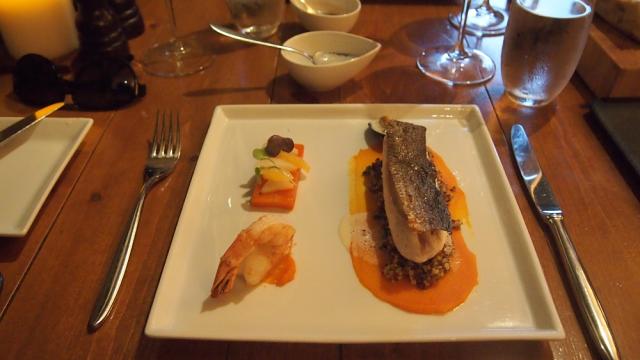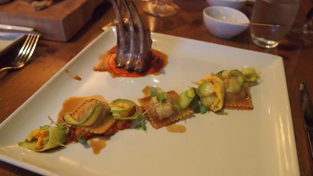 En plat principal a suivi le carré d'agneau cuit de façon traditionnelle avec l'épaule fondante en raviolis et sa purée de piquillos (petits piments rouges). La viande était parfaitement cuite et assaisonnée, mais les raviolis à la sauce au thym et ail rôti ont remporté la partie! Les courgettes et poivrons marinés donnaient de la fraîcheur à l'ensemble de l'assiette. Rien à redire.