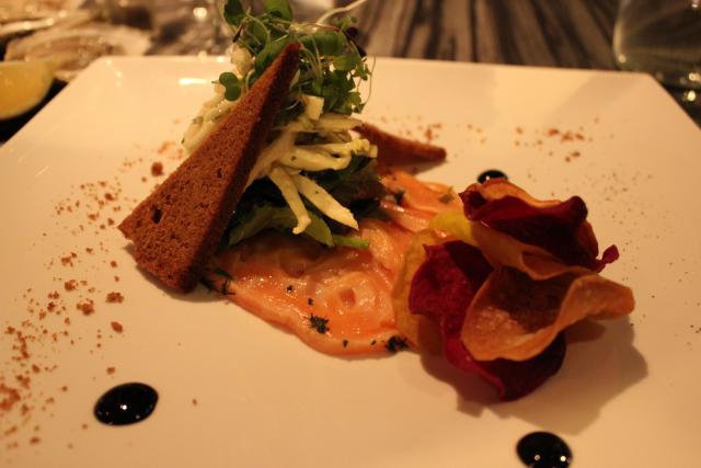 Cela dit, les plats sont savoureux et certains trucs arrivent à nous surprendre. Tout d'abord, on a adoré le beurre aux oignons caramélisés servi avec le pain. On a aussi beaucoup aimé le mélange des saveurs du saumon biologique mariné, style carpaccio, avec ses chips de légumes racines et sa rémoulade de céleri rave crémeuse aux agrumes. Belle surprise aussi que le clin d'œil à la salade César, servie avec un excellent poulet biologique mariné. Ah, le poulet bio!