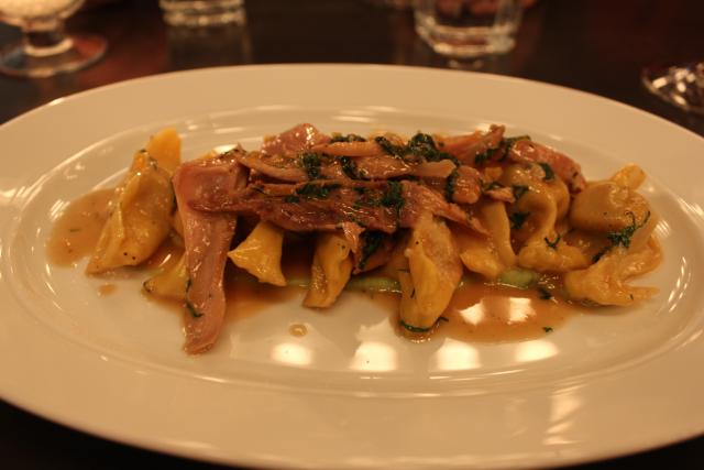 De mon côté, j'ai été intriguée par une entrée de «crudo» comprenant un oursin servi avec confiture de figues sur de la brioche rôtie, du bar rayé cru, accompagné de pamplemousse, gelée de gingembre, pollen de fenouil et du maquereau, citron écrasé, amandes et olives séchées. Le mélange de saveurs était assez surprenant en bouche. Peut-être le plat qui a le plus amusé mes papilles de la soirée!