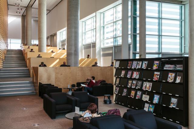 Cette nouvelle bibliothèque à deux pas du métro Rosemont regorge de créativité! Tout est en place pour créer un espace inspirant et même relaxant avec ses grandes fenêtres qu'y laissent entrer la lumière, le plancher végétal ainsi qu'un foyer central. Pour optimiser votre concentration, installez-vous dans la pièce où se trouve le foyer, elle est réservée aux gens qui souhaitent étudier dans le silence.