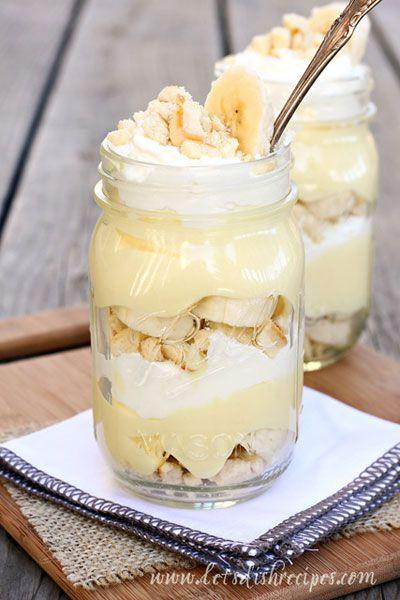 Les pots-Mason font très bon ménage avec les desserts! Que ce soit pour y faire un gâteau ou carrément y cuire une tarte, tout semble facile et délicieux! Cette recette de pudding aux bananes de Let's dish the recipes me paraît complètement décadente! J'ai hâte de l'essayer!