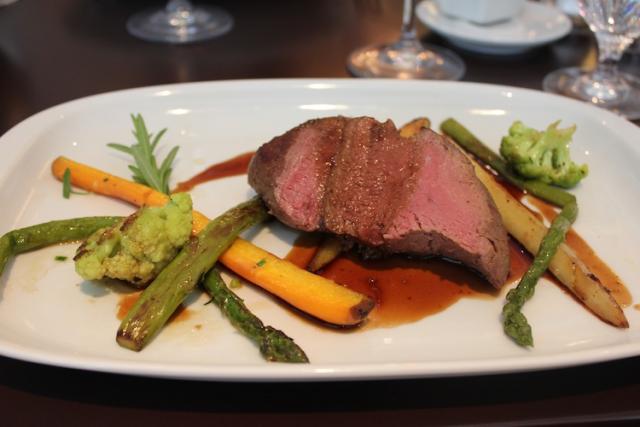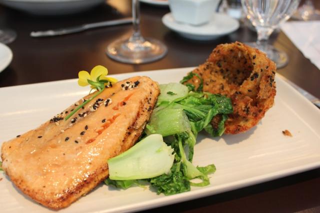 En plat principal, j'ai eu droit à de l'Omble chevaler de la Gaspésie, oignons frits en croûte de sésame et bok choy de la Montérégie. J'ai bien aimé la petite laque au soya et sésame rôti, mais j'ai préféré les saveurs plus en profondeur du médaillon de jeune wapiti grillé de ma voisine, avec ses asperges sauvages et sa sauce aux baies.