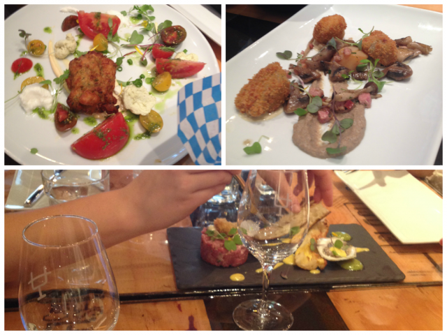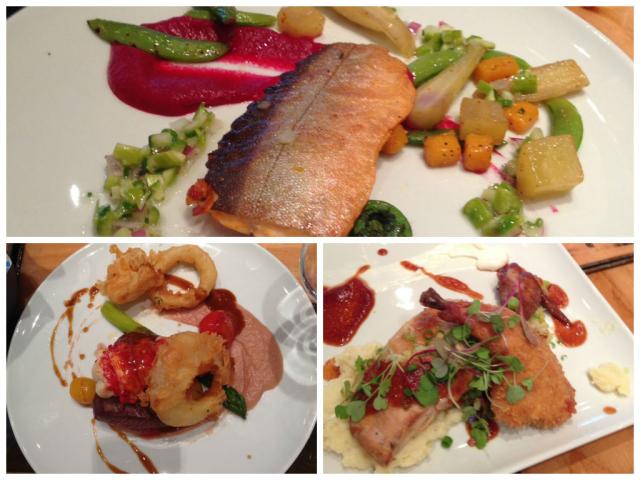 Se sont succédés ensuite un excellent surf and turf composé d'épaule de boeuf cuit sous vide pendant 10 heures (coup de coeur!), une queue de homard, avec des rondelles d'oignon et une sauce au whisky, de l'omble chevalier avec ses légumes et une sauce aux betteraves (délicat et savoureux). La dégustation s'est conclue sur un poulet saumuré 24 heures puis fumé 4h, accompagné d'une purée de pommes de terre et de légumes frais. Un peu trop salé à mon goût, mais c'est l'idée de la saumure! La viande était tendre et l'accompagnement succulent.
