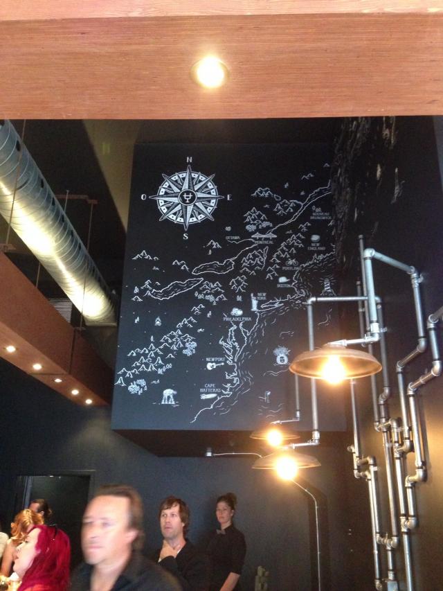«On a travaillé fort pour que ça ne ressemble plus à un magasin de matelas!», nous confie Julie Poulin, copropriétaire du restaurant. Et l'effet est très réussi! La décoration est sobre, mais impressionnante. L'ancien bâtiment comptait trois étages et les propriétaires Julie et François Forest ont fait des pieds et des mains pour utiliser l'espace au maximum. Les plafonds hauts ont été abaissés par des poutres et des colonnes en bois et un luminaire trône au centre de la pièce. Une fresque géante représentant une carte de la côte Est américaine maquille un coin du restaurant. Comme cadre final, un espadon géant est accroché au mur. «On a essayé de faire chic avec peu de moyens», continue Julie. «Ce bâtiment a beaucoup d'histoire, et il fallait respecter cela!»