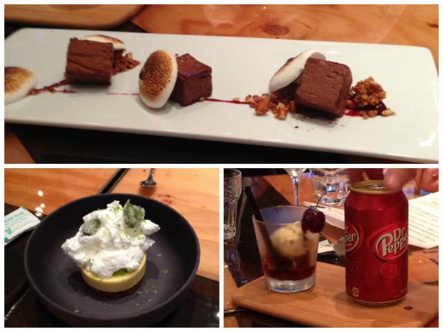 Gourmands que nous sommes, il nous restait encore un peu de place pour les desserts, composés d'une Henri Lime Pie (deuxième coup de coeur!!) de smore's et d'un flotteur. Je dois dire que, ayant la dent sucrée à souhait, j'attendais la tarte à la lime avec impatience et je n'ai pas été déçue! La lime se mariait avec de la menthe et une gelée au gin Ungava et menthe, mais le gin n'était pas décelable. Le tout était excellent et frais. Le smore's était très bon, le chocolat goûteux et la guimauve bien grillée. Le flotteur au Dr. Pepper nous a moins impressionné que les deux autres desserts.