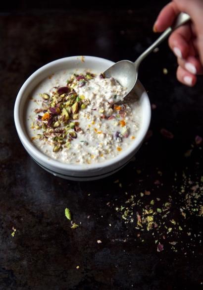 On mélange les ingrédients puis on place le tout dans un contenant hermétique. On peut remplacer le gruau instantané par des flocons complets, juste à laisser le gruau pendant au moins 12h au frigo. (recette et photo : Trois fois par jour)