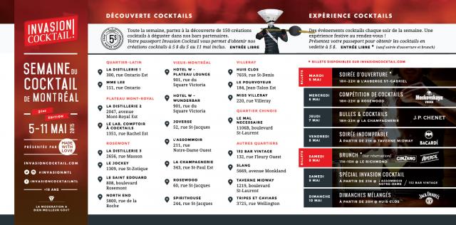 Invasion Cocktail, c'est un évènement te permettant de découvrir des bars de la ville. En gros, on s'achète un « passeport » au coût de 20$, puis on a droit au tarif préférentiel de 5$ pour chaque cocktail au menu. Il y aura plus de 150 cocktails à déguster : tu devrais donc en avoir pour ton argent (important de ne pas tous les consommer en une seule soirée, on le rappelle). Des établissements du Plateau Mont-Royal, de Rosemont, de Villeray, d'Ahuntsic et du Vieux-Montréal présenteront chacun 8 cocktails vedettes à leur image sur le menu Invasion Cocktail. Voici la liste des bars participants :