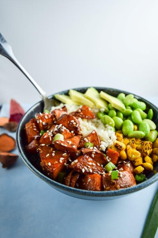 Ce bol de légumes comprenant patate douce, sauce teriyaki, riz de chou-fleur, edamame et bien sûr, avocat semble tout simplement divin! Elle se prépare également vraiment simplement, en seulement deux étapes faciles! (recette et photo : yupitsvegan)