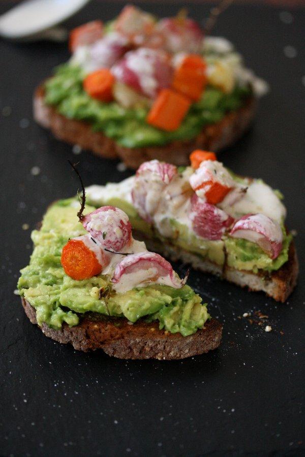 C'est fini les sandwiches : maintenant on mange des toasts! En voici qui semblent délicieuses, garnies de légumes rôtis et d'une bonne dose de vinaigrette au tahini. Un repas super simple et vraiment bon! (recette et photo : feedmephoebe)
