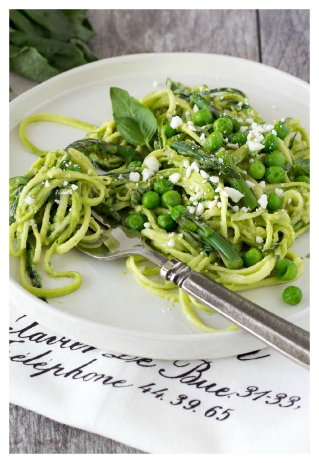 Cette recette de « pâtes » de zucchini est vraiment parfaite pour les chaudes journées d'été. À la fois légère, fraîche et surtout, satisfaisante, elle combine pois verts, avocats, asperges et courgettes saupoudrés de feta et noix de Grenoble. Si vous n'avez pas de « spiralizer » (le truc pour faire les pâtes de zucchini ), vous pouvez simplement utiliser un économe pour faire de fines tranches. (recette et photo : simplehealthykitchen)