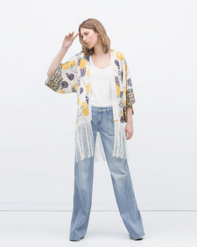 Cet été, il est officiellement permis d'abuser des motifs à fleurs. On aime bien ce modèle-ci pour ses minces franges au rebord et son mélange d'imprimés. Il rappelle le look des années 70 juste ce qu'il faut porté avec un jeans à jambe évasée.