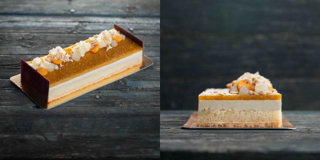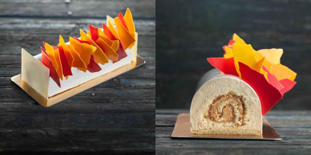 Une bûche aux saveurs et textures contrastées, tout en équilibre, combinant le doux marron, le citron caramélisé, les parfums complexes du thé vert matcha et une mousse aérienne au fruit de la passion; sans noix, sans gluten