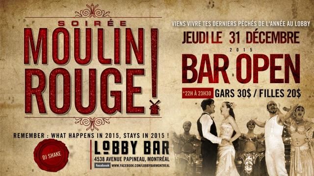 Ton film préféré c'est le Moulin Rouge? C'est au Lobby Bar que tu dois être pour le Nouvel An! Arrive tôt, car ce sera bar open entre 22h et 23h30 alors tu ne voudras surement pas manquer ça.