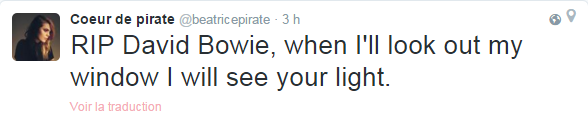 Béatrice Martin, alias Coeur de Pirate a parlé au nom du Québec : "RIP David Bowie, quand je regarde à ma fenêtre, je vois ta lumière".