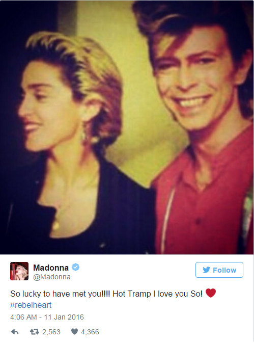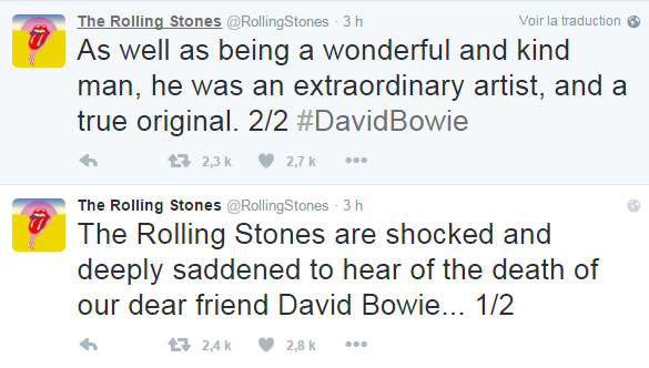 « Nous sommes choqués et profondément tristes de la mort de notre cher ami David Bowie. C'était un homme à la fois merveilleux et gentil, et un artiste extraordinaire et original », ont twitté les Rolling Stones.