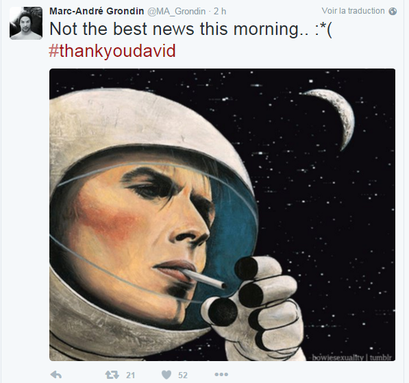 Marc-André Grondin n'a pas appris "la meilleure des nouvelles ce matin". On se rappelle tous très bien la scène culte dans le film C.R.A.Z.Y où Marc-André Grondin interprétait brillamment Space Oddity.