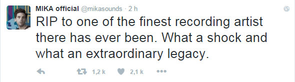 "RIP à l'un des meilleurs artistes de tous les temps. Quel choc et quel extraordinaire héritage.