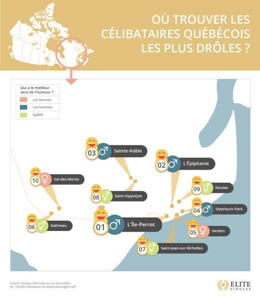 Note bien que ce sont les hommes célibataires de L'Île Perrot qui sont les plus drôles. Les femmes les plus drôles se trouvent à Verdun! Quant à la ville dont le sens de l'humour le plus grand est partagé également entre les hommes et les femmes, c'est Gatineau qui se retrouve en tête!