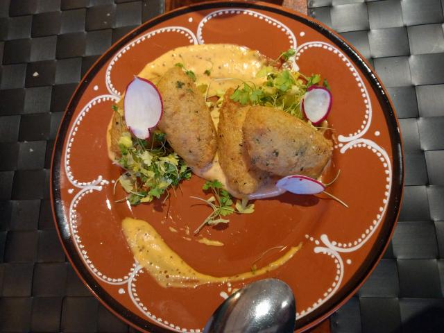 Nous avons débuté par des accras de morue. Les croquettes sont façonnées en forme de quenelles avant d'être enduites de pâte et frites. Le goût de la morue est bien présent, salé à souhait et la texture est moelleuse. La mayonnaise au piri piri ajoute une touche de piquant très appréciée.