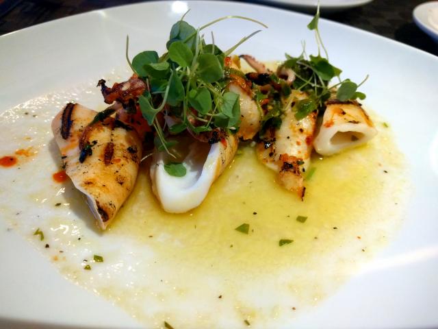 Le calmar est grillé, entier, avant d'être coupé et servi avec une sauce au beurre et citron. La cuisson du calmar en entier fait en sorte que la chair reste bien tendre. Le goût de la grillade est bien présent et la sauce apporte le gras ainsi que l'acidité requise. Il manquait juste une touche de sel pour que le plat soit parfait.