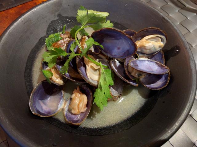 Les palourdes sont servies dans un bouillon de vin blanc, citron et coriandre. Celles-ci sont cuites parfaitement, mais elles sont légèrement sableuses. Le bouillon est très concentré. Un peu trop salé pour mon collègue et un peu trop iodé pour moi.