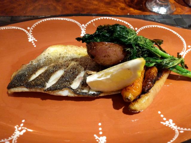Le loup de mer est servi avec des carottes et des patates rôties au four et du rapini poêlé. Le poisson est d'une fraîcheur exemplaire et il est cuit à la perfection. La peau est craquante, la chair est tendre et elle fond dans la bouche. Le seul bémol, les carottes sont légèrement brûlées.