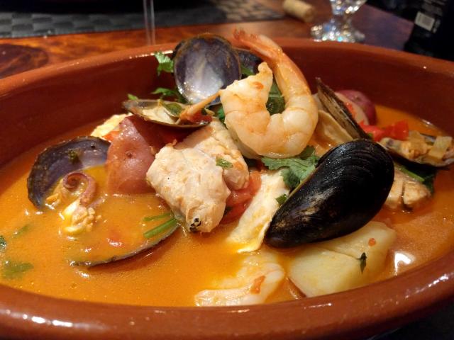 La bouillabaisse est faite avec un bouillon à base de tomates, de poivrons et de vin blanc. On y ajoute ensuite des palourdes, des moules, des crevettes, du loup de mer et de la lotte. Tout est cuit à la perfection sauf la crevette qui semble un tantinet dure. La cuisson du poisson est encore une fois parfaite. Un plat très réconfortant et très bien balancé. Le goût de la tomate et du poivron est présent et le jus des fruits de mer donne de la profondeur au bouillon.