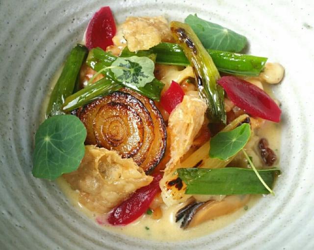 Crédit photo Sophie GinouxSuit dans une grande assiette odorante, dont le pourtour constitué de branches de genévrier a été légèrement brûlé pour en faire ressortir les arômes, un délicat pétoncle de Gaspésie cru finement tranché et accompagné par un mélange de babeurre, de vinaigre de fleur de sureau, de baies de cornouiller, de graines de moutarde marinées et de salicorne. Encore une fois, l'approche du chef a été d'une grande délicatesse, respectant la fragilité du pétoncle tout en l'associant à des saveurs, textures, et pour ce plat d'odeurs qui transportent nos sens comme nos papilles.