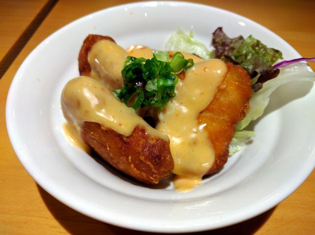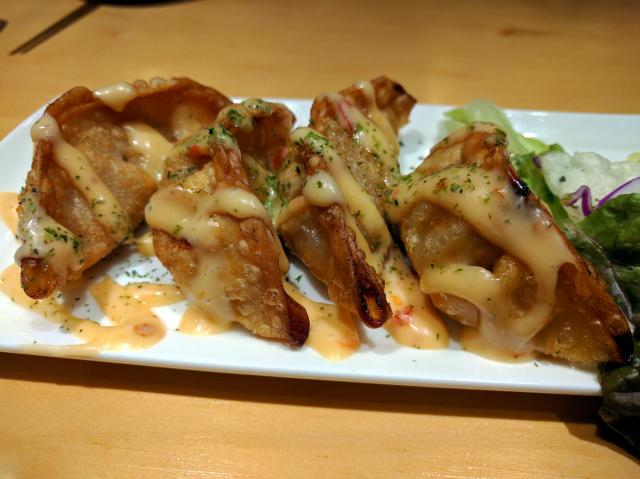 Gyoza (dumpling frit). À base de porc et gingembre, l'ensemble n'est pas trop salé et la sauce à base de mayonnaise complète le tout. C'est frit, c'est bon et c'est parfait avec une bière!