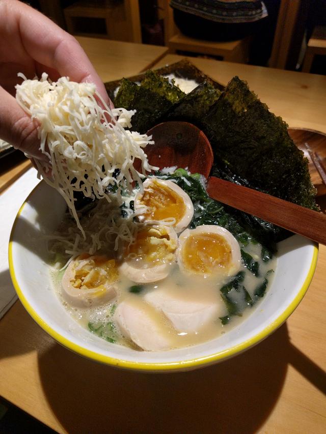 Le ramen au poulet avec nouilles minces et un oeuf d'extra et du fromage suisse en extra. La saveur du bouillon est riche, grasse et ça goûte la peau de poulet grillée. Les nouilles sont minces avec juste assez de mordant. L'oeuf est très bien assaisonné, un des meilleurs à Montréal! L'utilisation du fromage suisse me semble à priori très bizarre. Mais il y a une saveur dans le fromage qui est très près de l'umami et ça, ça va très bien avec le ramen. Et en plus, ça épaissit le bouillon! Déstabilisant, mais fort intéressant. Du pur bonheur dans un bol!