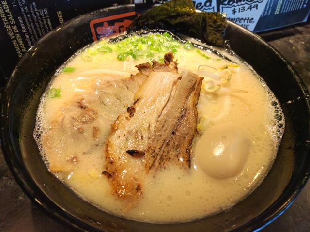 Le ramen au porc original avec nouilles épaisses. Cette variation sur un tonkontsu offre un bouillon à base de porc et de poulet qui est riche, gras, onctueux et parfaitement salé. Comme il se doit, le goût du porc est très présent. L'ajout d'un peu de bouillon de poulet apporte une autre dimension à ce ramen. Vers la fin, le goût du poulet grillé ressort et c'est assez agréable. Les nouilles sont parfaites. Elles sont épaisses, ondulées et offrent une excellente résistance sous la dent. Le flanc de porc est torché ce qui apporte un peu plus de saveur.