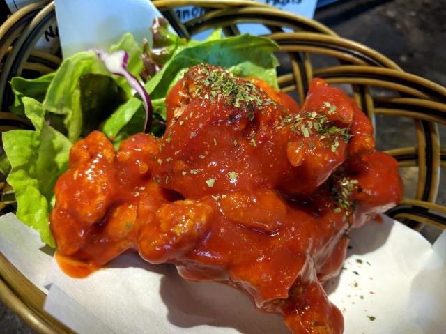Le karaage est aussi offert en version épicée. À mon avis, c'est un peu moins réussi. En couvrant le poulet frit de sauce, la panure devient molle et on perd le côté bien croustillant de celle-ci. De plus, la sauce au sriracha est bonne, mais rien d'extraordinaire. Elle a un bon kick par contre.