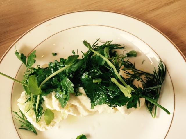 Le fromage maison est un choix heureux, douillet, et tout de blanc ce qui est très tendance dans les non-couleurs actuelles. Il est abondamment garni d'une couronne de fines herbes, ce qui finalement lui donne des airs et des saveurs de salade d'herbes au fromage frais.