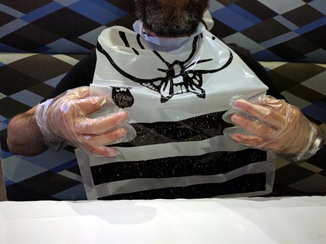 Il y a beaucoup de restaurants de tous les genres et de tous les styles à Montréal. Un style complètement absent de la scène montréalaise est le « seafood boil ». Un boil est relativement simple : des fruits de mer de qualité cuits avec des accompagnements dans un bouillon. Simple et efficace. Le style de boil offert par le restaurant est de la Louisiane. Ce style se démarque par la présence de cayenne et d'un bouillon assez épicé. Et à notre arrivée, nous savions que ce serait un peu salissant comme souper. Sur la table nous attendait : une bavette, une paire de gants et un méga rouleau de papier essuie-tout. Manger avec ses mains est un doux plaisir qu'on ne s'offre pas assez souvent. C'est une partie très importante de l'expérience au festin du capitaine.