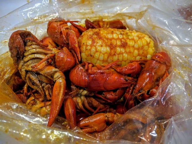 La seconde commande à arriver était des écrevisses avec du maïs et de la saucisse. Assez classique comme assemblage. Nous avons choisi cajun médium comme sauce. Encore une fois, la sauce était vraiment forte. Ceci confirme que la première commande n'était pas une erreur, médium c'est assez canon ! En mangeant le maïs, je me disais que plus jamais je ne le ferais simplement bouillir dans de l'eau. La saveur de celui-ci cuit dans un bouillon épicé était excellent. Le côté sucré du maïs venait balancer la sauce épicée. La saucisse de porc fumé apportait une saveur très typique d'un boil et se mariait bien avec la sauce. Les écrevisses étaient bien cuit. C'est toujours un défi de manger des écrevisses, mais c'est un incontournable pour ce genre de repas. En sortant, nous avons croisé des amies qui y mangeaient et nous avons subtilisé une de leur frite de pommes de terre douces. Nous aurions dû en commander lors du repas, elles aident à donner un répit à notre bouche avec leur côté sucré !