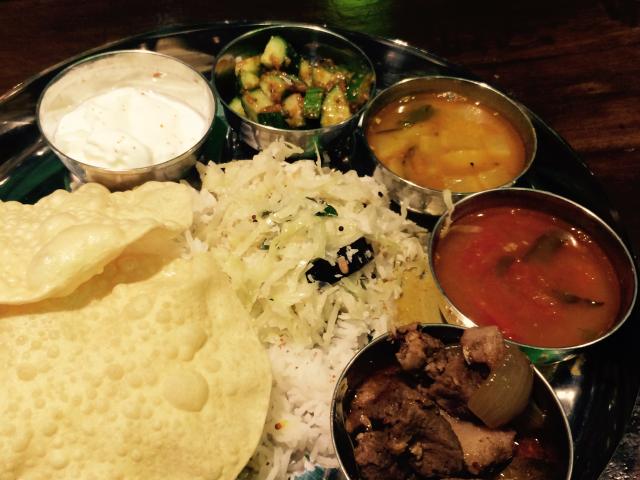 Les thalis – des assiettes « combo » proposées ici en version végé ou à la viande, permettent de goûter à plein de différentes saveurs successivement, le tout ponctué de généreuses portions de riz si on ne veut pas se brûler la langue avant tant d'épices et de feu.