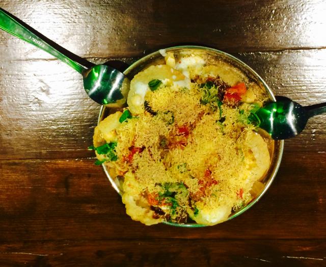 Cette petite entrée est fameuse. Des coquilles croustillantes farcies de pommes de terre et de pois chiches surmontées de – attache ta tuque la liste des ingrédients est longue – yogourt, de chutney au tamarin, de chutney au piment et à l'ail, d'un mélange d'épice chaat masala maison, de sel noir sulfureux de l'Himalaya, de tomates, de coriandre fraîche, et finalement, de sev, des nouilles de pois chiches frites.