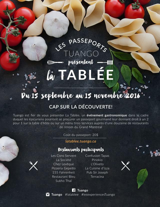 Pour cette première édition, près d'une quinzaine de restaurants ont décidé de faire partie de l'aventure dont Pinokio, 155 Fahrenheit, Les Cons Servent et Safehouse. La liste compète des restaurants participants se trouve sur le site de La Tablée, où vous pourrez aussi consulter les menus des différents établissements. Faut savoir aussi qu'à l'achat du passeport, tu reçois 13 coupons, soit 1 coupon pour chacun des restaurants participants.