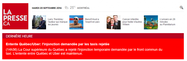 Et voilà qu'il y a quelques minutes, le site web de La Presse nous apprenait que l'injonction qui avait été demandée par les taxis venait d'être rejetée, signifiant que l'entente entre le gouvernement du Québec et Uber est maintenue.