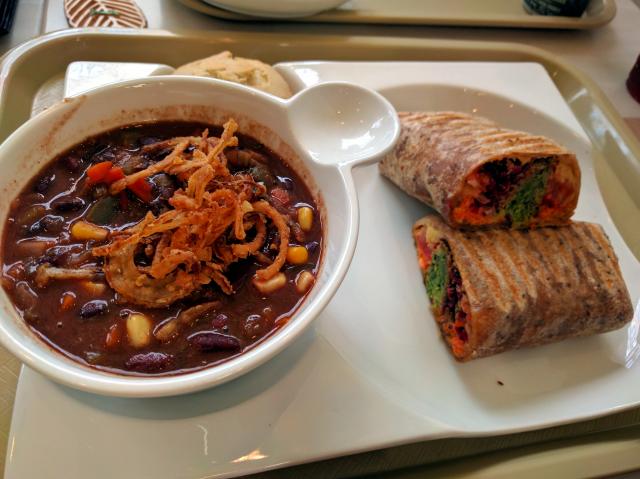 Le chili végétarien était unidimensionnel. On goûtait un peu de chaleur de la poudre de chili, mais rien d'autre. Certes, l'oignon frit apportait un peu de goût et de texture, mais il manquait d'épices et d'aromates pour développer plus de saveurs à un plat qui n'en manque pas habituellement! Le wrap était correct, sans plus et sans surprise.