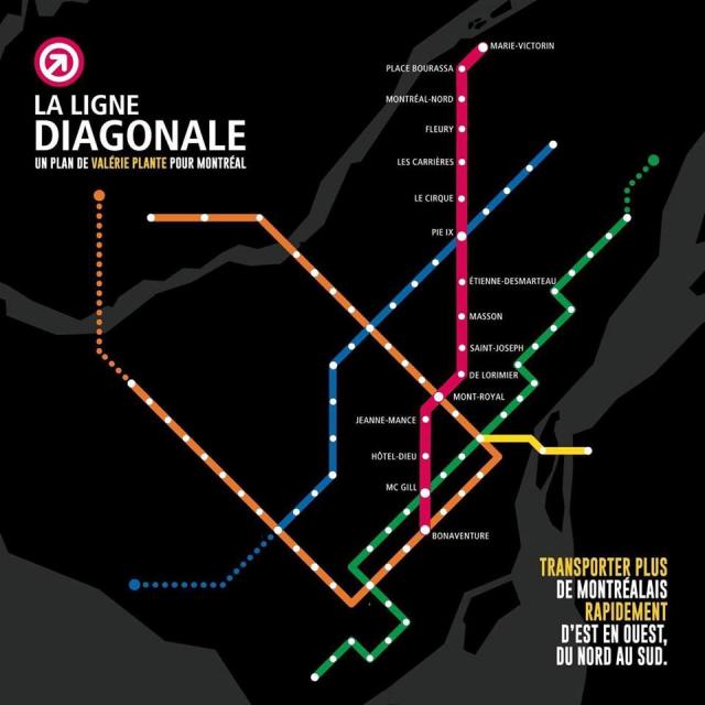 Chez NIGHTLIFE.CA, on aime toujours ça, les spéculations à propos du prolongement ou de l'ajout de lignes de métro de Montréal. Parce qu'après tout, ça coûte rien de rêver! Alors que, comme on l'a dit, ces idées sont très souvent des spéculations et des rêves que certains citoyens ont qui, malheureusement, ne verront jamais le jour, voilà que ce matin, une nouvelle idée pour le plan du métro a été annoncée. Idée qui, celle-là, pourrait possiblement voir le jour, car c'est une idée de Valérie Plante, candidate à la chefferie de Projet Montréal. Si elle prend la tête du partie en décembre, puis qu'elle est élue mairesse en 2017, Valérie Plante a en tête d'implanter une nouvelle ligne de métro: « la ligne diagonale ».