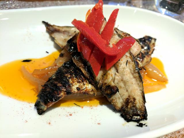 La sardine est le poisson qui m'a le plus marqué lors de ma visite au Portugal il y a moult années. C'était d'ailleurs le premier plat de la soirée. Il était fileté avant d'être grillé superbement. La peau craquait sous la dent, comme elle se doit. Le mélange de poivrons marinés et d'oignons était un bon choix d'accompagnement pour ce poisson robuste en saveur. Le plat était juste assez salé et malgré la présence de passablement beaucoup d'huile dans l'assiette, le plat n'était pas trop huileux. Et ce, même si la sardine est un poisson gras à la base. Très bon plat !