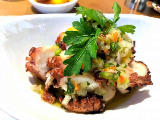 Je manque rarement l'occasion de manger de la pieuvre et comme il y en avait sur le menu, je me devais de l'essayer. La pieuvre était elle aussi superbement bien grillée. Accompagnée de poivrons rouges et verts, d'oignons et nappée d'une huile d'olive. La présentation peut sembler simple, mais c'était efficace. Chaque morceau était tendre à souhait. L'huile par contre était un tantinet trop herbeuse pour le plat et si on en prenait trop avec une bouchée, celle-ci masquait le goût délicat de la pieuvre. Bien fait, mais attention à l'huile d'olive !