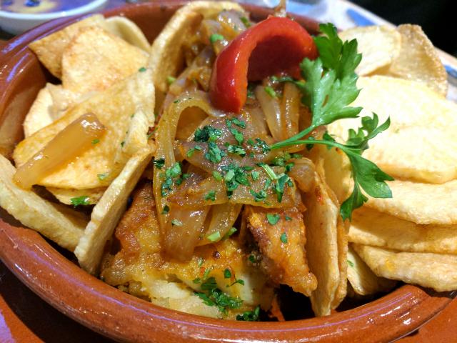 La morue est un autre poisson assez commun dans la cuisine portugaise. Il y avait d'ailleurs plusieurs plats de morue au menu. Mon choix de la soirée était la morue Aldea. Le filet était poêlé avant d'être transféré dans un plat de céramique pour terminer sa cuisson au four. Le tout était accompagné d'épaisses chips maison. La double cuisson d'un poisson me fait toujours peur, le risque de surcuire celui-ci étant très grand. Malgré la présence d'une croûte très TRÈS croquante, le poisson à l'intérieur était tendre et moelleux. Comme il n'y avait pas d'huile dans le plat avant son passage au four, la peau de la morue est restée tristement collée sur le fond du plat. Je dis tristement, car une peau de poisson bien craquante est essentielle dans ce genre de plat. Les chips étaient bonnes quoiqu'elles manquaient légèrement de sel. Le piment mariné était assez acidulé, vous êtes averties !