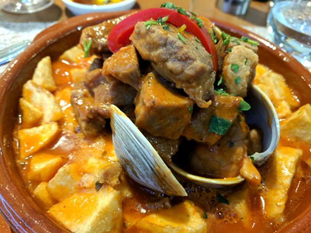 Comme plat de viande, nous avons choisi le porc aux palourdes. La cuisson du porc était parfaite et il était tendre. Le bouillon était savoureux, mais avait un goût plutôt prononcé de pâte de tomates. Les patates étaient en revanche bien faites. Les palourdes, juste cuites à point, étaient excellentes et leur goût était bien présent dans le plat. Il manquait un tout petit peu de sel dans le plat. J'aurai aimé un meilleur équilibre dans le plat en ayant un peu moins de pâte de tomates. Les portions des entrées ainsi que les plats principaux sont de très bonnes tailles. Nous étions pleins avant la fin de nos plats principaux !