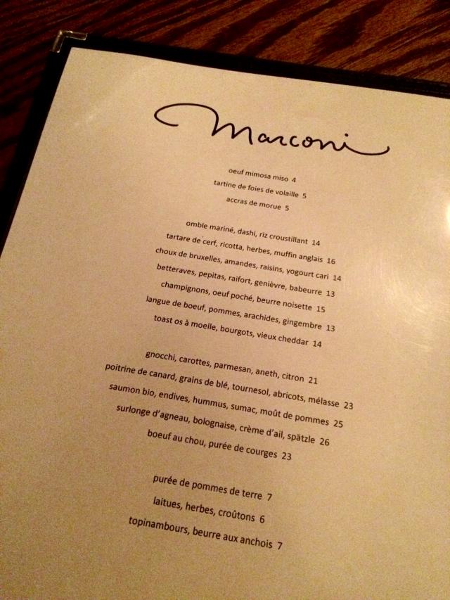 Surlonge d'agneau, bolognaise, crème d'ail, spätzle, 24$L'expérience Marconi se renouvèlera très certainement dans mon cas, et j'espère dans le vôtre. J'en profiterai pour goûter à l'un de ces cocktails qui semblent tous couler d'une fontaine du bonheur.