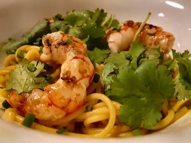 J'opte ce soir pour deux plats et un dessert. Le temps de goûter avec la charmante sommelière le vin nature au verre qu'elle m'a conseillé – la carte des vins du Rosie est vraiment intéressante et jouit d'un très bon rapport qualité-prix – le premier plat arrive sur la table. Il s'agit d'un spaghetti aux crevettes, Savora (un condiment français), radis et coriandre. Le dressage et la générosité de l'assiette ne sont pas exceptionnels, mais les ingrédients qui la composent et sa préparation compensent largement ces lacunes. Les pâtes sont al dente, les grosses crevettes parfaitement cuites, les radis et la coriandre apportent de la fraîcheur, et le bouillon à base de Savora est tout simplement délicieux. Pour le saucer jusqu'à la dernière goutte, je n'hésite pas à demander, moyennant un petit extra de 3$, une portion de pain qui provient de la boulangerie Automne. Ça commence bien.