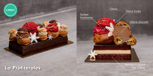 CRémy Pâtissier ne fait pas les choses à moitié et ça s'applique aussi en matière de bûche de Noël. Celle qui nous fait le plus saliver parmi la belle sélection est « La Profitéroles ». Cette dernière est faite d'un sandwich glacé Joe Crémy, sur lequel est déposé de choux fourrés au sorbet à la framboise ou de glace au chocolat. Qui peut résister à ça!?
