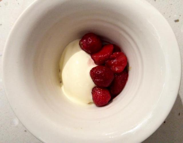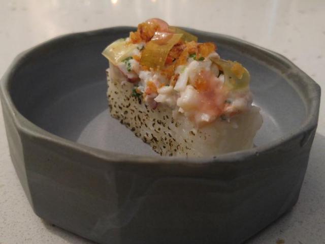J'ai en mémoire ce plat — un de mes favoris de la soirée —, faisant un clin d'œil au sushi. L'unique « Homard », tel qu'inscrit sur le menu, ne rend pas hommage à la maîtrise et alliance de techniques et de saveurs. D'abord, le riz à sushi est exécuté à la perfection ; juste assez collant et vinaigré. Puis, le homard taillé est magnifiquement entouré d'un gel de rhubarbe, d'une émulsion de pinces à homard, de ciboulettes fraîches et légèrement rehaussé de kombu blanc. En ajoutant le plaisir de déguster avec ses doigts cette création, mon bonheur était à son comble.